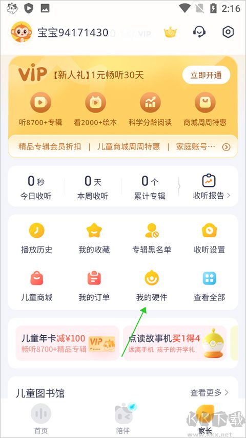 1、進(jìn)入家長頁面中,點(diǎn)擊【我的硬件】