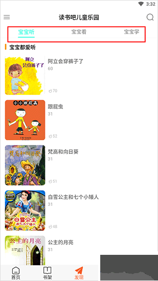3、在發(fā)現(xiàn)模塊還可以根據(jù)寶寶聽、寶寶看、寶寶學(xué)等欄目進(jìn)行查找