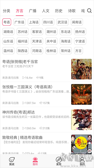 2、【曲藝大全】網(wǎng)羅了全國各地的方言藝術(shù)精華,包括評書、戲曲、民間小調(diào)、相聲等經(jīng)典音頻,還有原汁原味的地方電臺(tái)節(jié)目。