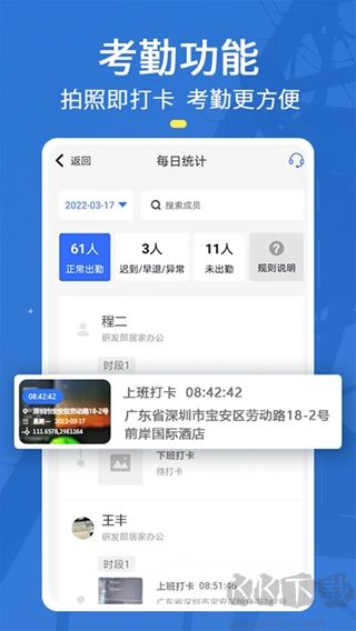 自動(dòng)添加防偽水印,時(shí)間、地點(diǎn)信息鎖定不可更改,確??记谟涗浾鎸?shí)可信,工作管理更規(guī)范。
