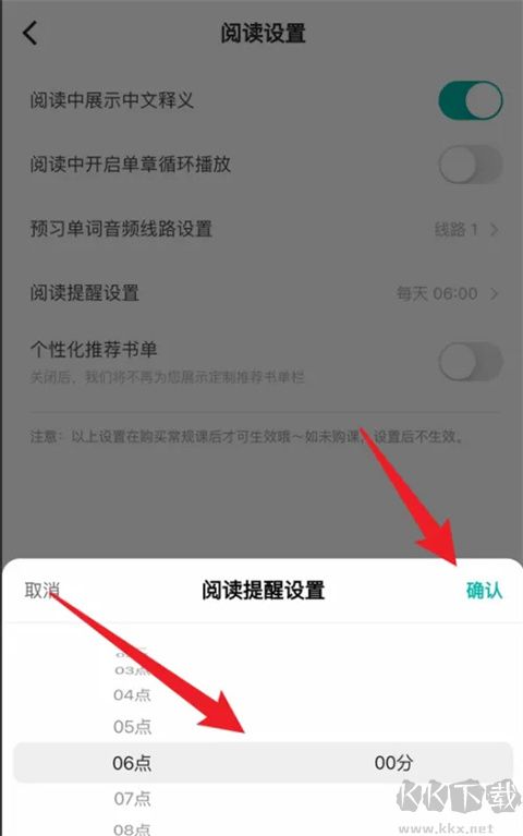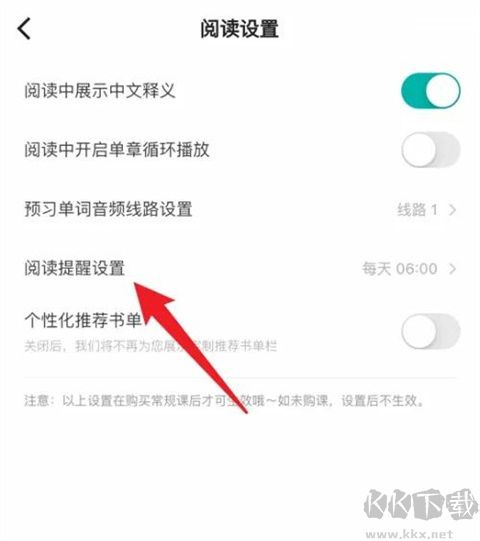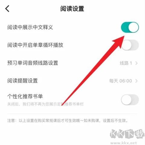 2、在設(shè)置頁面上方找到 “閱讀中展示中文釋義” 的開關(guān)。