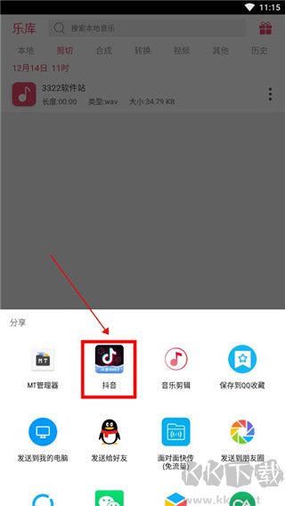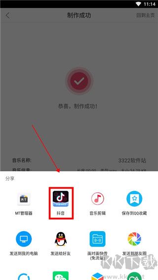 4、在更多功能中點擊【分享】,選擇抖音即可將制作好的音樂上傳至平臺。