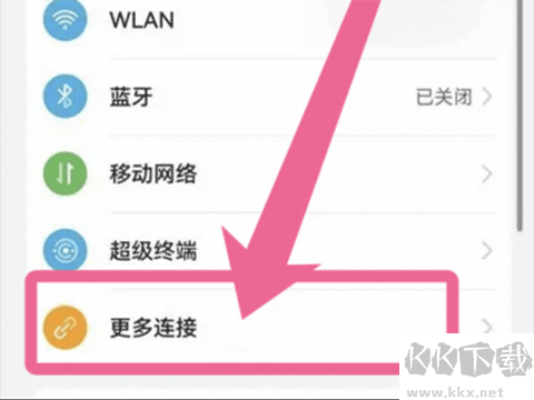 1、先在kk下載站下載安裝程序,然后進入手機設(shè)置頁面,找到并點擊更多連接。