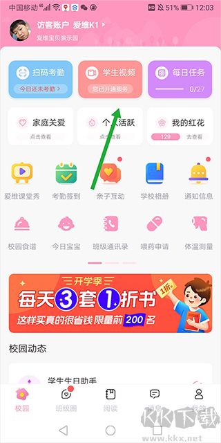 3、若只綁定一個(gè)視頻設(shè)備,可直接在 app 首頁(yè)點(diǎn)擊【學(xué)生視頻】。