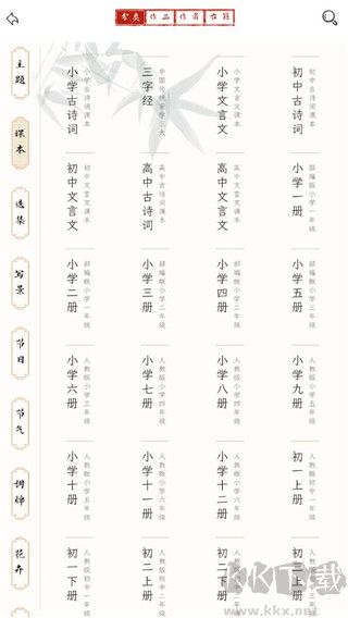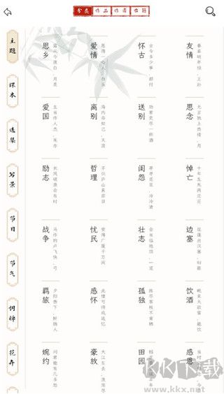 4、書閣分類詳盡,包含主題、課本、選集、寫景、節(jié)日、節(jié)氣等類別。
