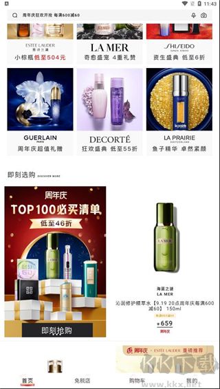 2、首頁有免稅店、購物車、我的、首頁 4 大板塊,方便快捷瀏覽操作。