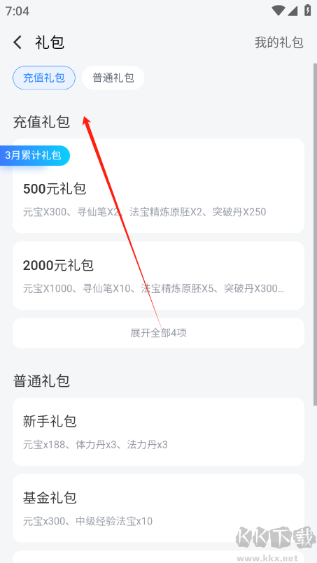 2、點(diǎn)擊頁(yè)面中的 “禮包” 功能,查看游戲?yàn)橥婕覝?zhǔn)備的禮包。
