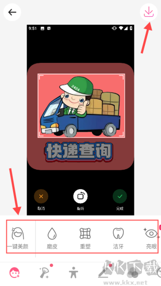3、根據(jù)需要選擇美顏、磨皮、重塑等功能按鈕,完成后點(diǎn)擊頁面右上方的下載按鈕進(jìn)行保存