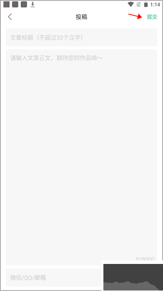 4、就可以開始輸入自己寫的故事,留下自己的聯(lián)系方式之后,點(diǎn)擊右上角的“提交”,這樣就是投稿成功了