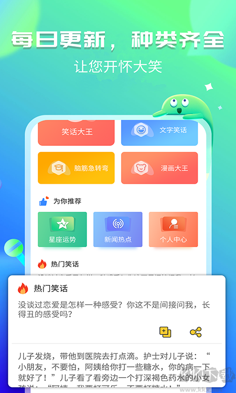 2、【每日笑料大放送】每天都有上百條新鮮出爐的冷笑話、幽默段子更新,保證讓你每天都能發(fā)現(xiàn)新笑點(diǎn),刷到停不下來!
