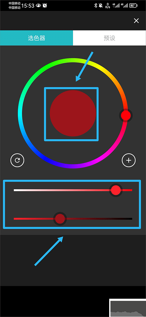2、然后在選色器中選擇你喜歡的顏色,選中顏色后你還可以使用下方兩個(gè)按鈕來操控顏色的深淺,調(diào)好色后點(diǎn)擊中間的顏色即可