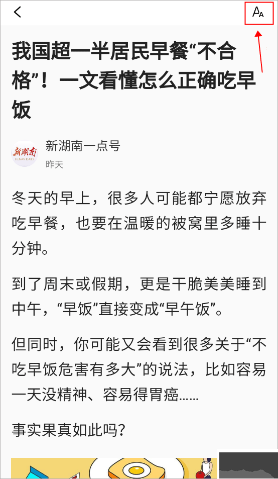 在打開新聞早知道軟件之后,如果因?yàn)樽煮w太小了你們想要去調(diào)整字體讓自己看清楚一點(diǎn)的話,你們要做的事情打開一篇你們想要觀看的新聞之后,你們就可以看到右上角的地方會(huì)有一個(gè)【AA】。