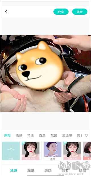 2、隨后我們可以對(duì)照片進(jìn)行編輯,添加濾鏡、貼紙,進(jìn)行美顏等操作,點(diǎn)擊下方的“貼圖”進(jìn)入;
