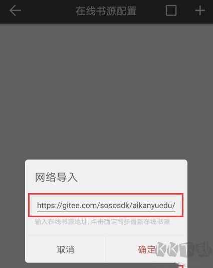 5、選擇網(wǎng)絡(luò)導(dǎo)入或者本地導(dǎo)入。這里以網(wǎng)絡(luò)導(dǎo)入為例,點(diǎn)擊進(jìn)去后,就可以輸入在線書(shū)源的地址,然后點(diǎn)擊確定即可。