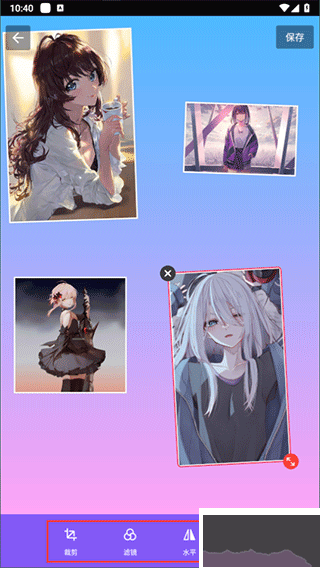 4、然后我們就可以自由移動(dòng)每一個(gè)圖片的位置了,如果想要編輯圖片,也可以單擊圖片,為其【裁剪】、添加【濾鏡】、【水平】或者【垂直】反轉(zhuǎn)等等;