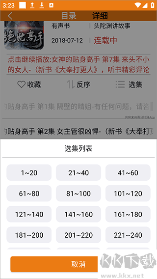 3、進(jìn)入資源詳情頁后、點(diǎn)擊目錄即可開始播放、如果想快速跳轉(zhuǎn)、可以使用選集功能、精準(zhǔn)定位到小說、相聲或評(píng)書的指定章節(jié)