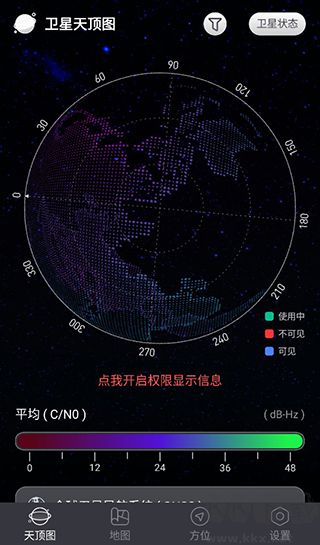 2、 天頂圖可查看衛(wèi)星天頂圖,每一個衛(wèi)星的方位和狀態(tài)都會顯示在地圖上。