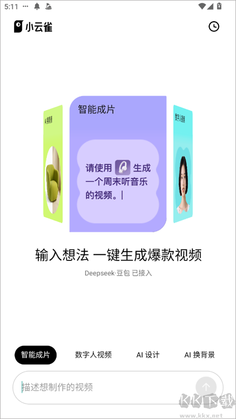 小云雀app是一款AI視頻和圖片創(chuàng)作助手,支持AI智能成片、數(shù)字人視頻、AI設計、換背景等多種功能,可以為用戶提供創(chuàng)作靈感、輔助寫作和平時文案等服務,幫助用戶進行內(nèi)容創(chuàng)作。軟件操作簡單,就算你是新手小白也可以很快上手使用。喜歡的朋友快來下載試試吧!