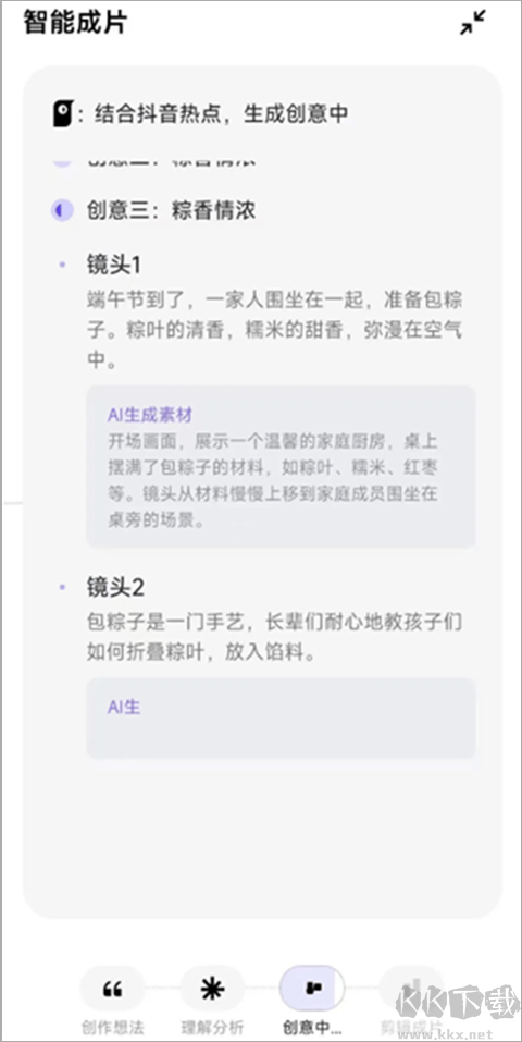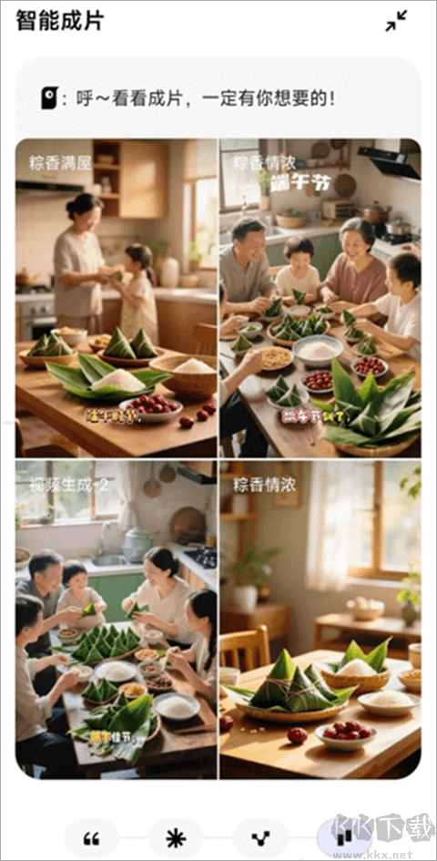 選擇“智能成片”,在對話框輸入想做的內(nèi)容,比如“端午節(jié)一家人包粽子”