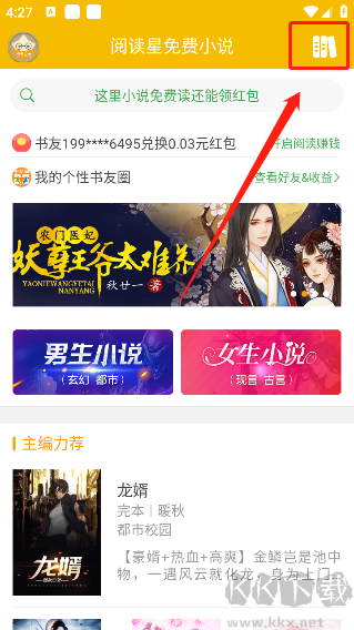 1、打開(kāi)閱讀星后,點(diǎn)擊右上角的「書(shū)架」按鈕,進(jìn)入你的個(gè)人書(shū)庫(kù)。