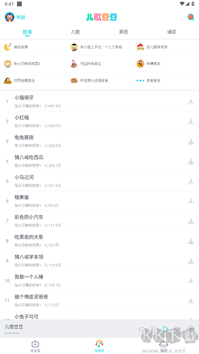 3、進入寶寶聽頁面可以收聽睡前故事、格林童話、成語故事、兒歌等等