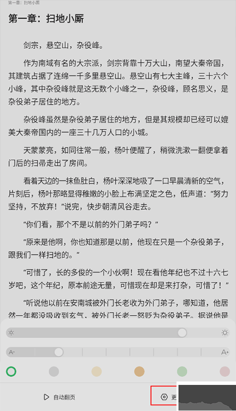 1、同樣是在小說閱讀界面先點擊屏幕可以看到底部有一個“設(shè)置”-“更多設(shè)置”