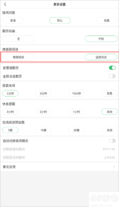 2、進(jìn)入更多設(shè)置頁面,在橫豎屏閱讀一欄選擇“橫屏閱讀”就可以啦。