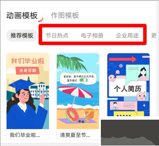 1、進入app首頁往下拉,可以看到不同場景分類的模板,如果在這些分類中沒有找到想要的模板,可以左滑分類找到【更多模板】進入【模板中心】