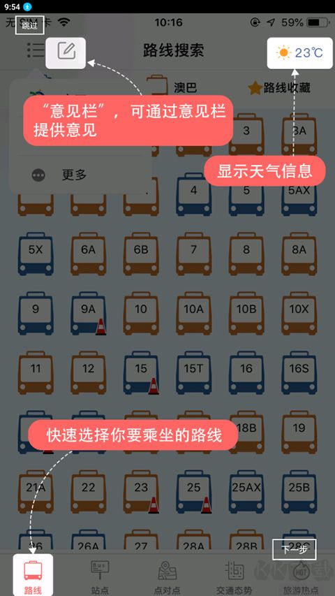 2、在“路線”頁面,直接選擇你要搭的巴士線路,所有車次都列得清清楚楚。左上角有個“意見反饋”按鈕,有啥建議隨時提。右上角還能順便看看天氣,出門前心里更有底。