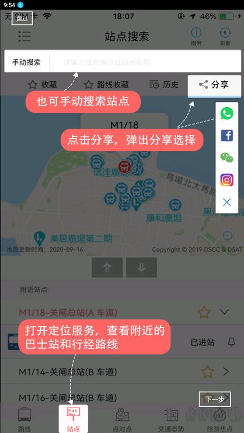 3、切換到“站點”頁面,打開定位就能自動顯示附近的巴士站,還能看到每趟車的行駛路線。要是定位不準,手動搜站名也行,找到后還能一鍵分享給朋友,約人碰頭特別方便。