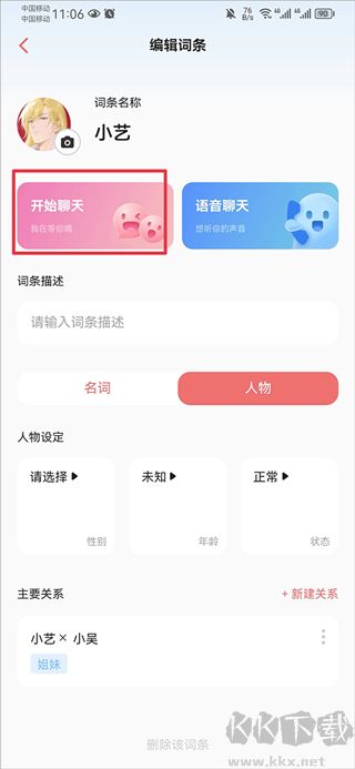 4、在人物詞條界面中點擊開始聊天就可以和自己創(chuàng)建的角色對話啦
