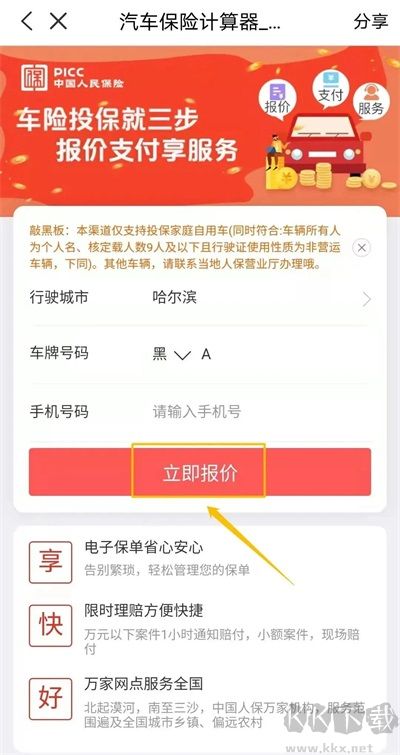 3.填寫所在城市、車牌號(hào)碼、手機(jī)號(hào)等必要信息,點(diǎn)擊“立即報(bào)價(jià)”等后續(xù)操作完成車險(xiǎn)投保