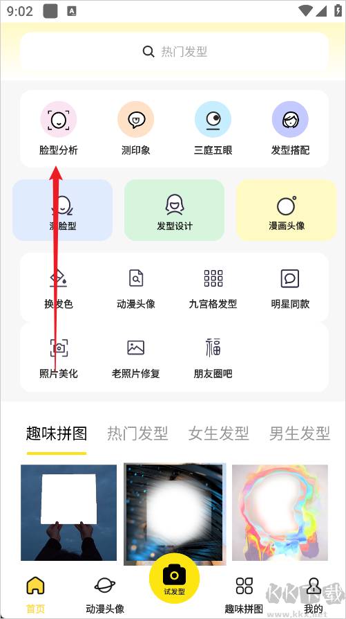 1、打開試發(fā)型相機在功能選項中,點擊“臉型分析”;