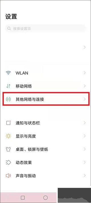 在手機屏幕上方下拉,進入設(shè)置,選擇“其他網(wǎng)絡(luò)與連接”。