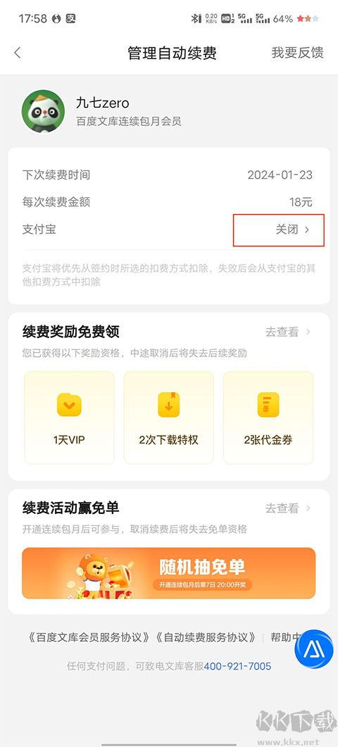 3、選擇“關閉”,確認取消自動續(xù)費。