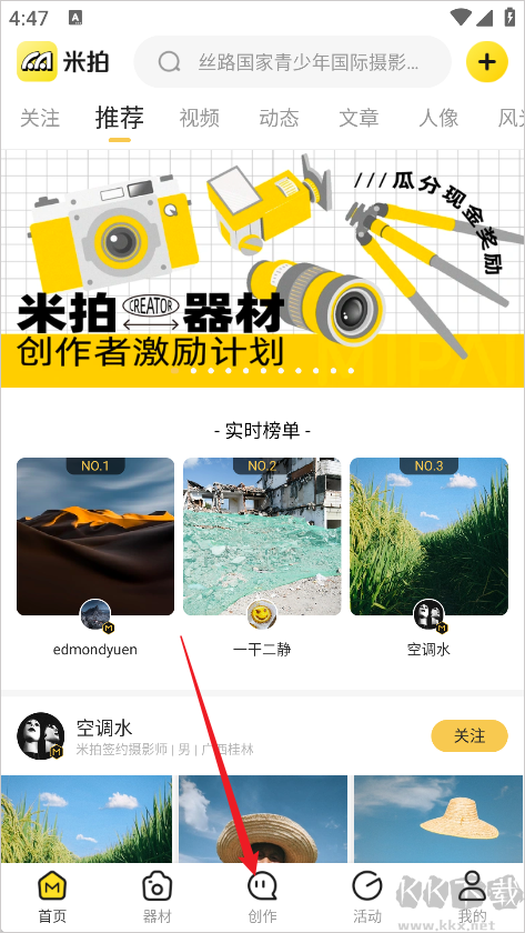1、打開米拍攝影APP,進(jìn)入到用戶界面,點(diǎn)擊頁面下方的創(chuàng)作按鈕;