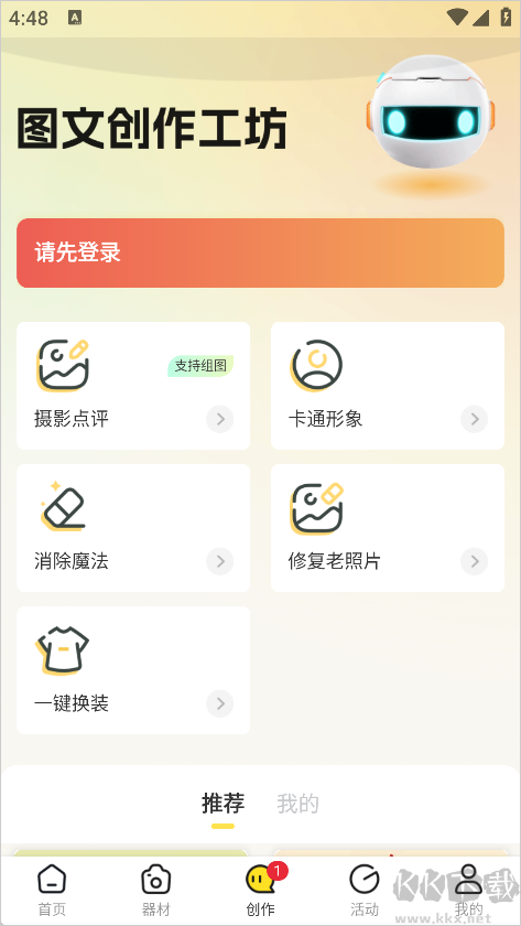 2、在創(chuàng)作頁面中可以看到有攝影點(diǎn)評(píng)、修復(fù)老照片等選項(xiàng),選擇自己需要的點(diǎn)擊進(jìn)入,這里以修復(fù)老照片舉例;