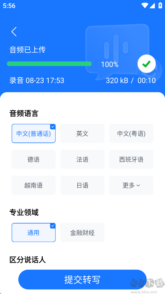 4、選擇原音頻語言和其他選項(xiàng),點(diǎn)擊【提交轉(zhuǎn)寫】