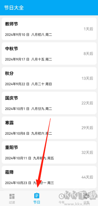 3、“節(jié)日”功能可查看距今年內(nèi)剩余節(jié)日的天數(shù);
