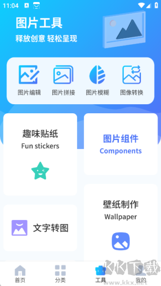 3、工具頁集成多項圖片處理功能,如編輯、拼接與模糊效果等;
