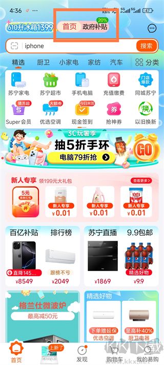 1、打開應(yīng)用,首頁上方可找到“政府補貼”入口