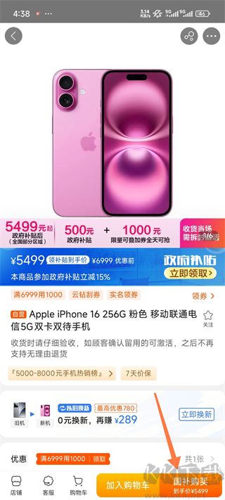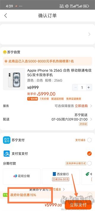 6、填寫收貨地址并完成支付,頁面會明確顯示“政府補貼優(yōu)惠15%”