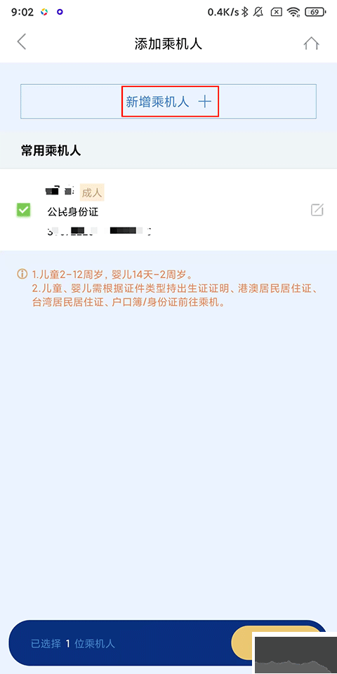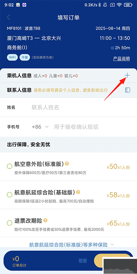3、進入訂單填寫頁后,點擊“乘機人信息”右側(cè)的“+”圖標