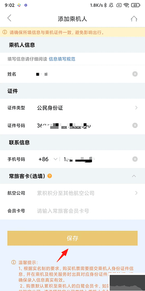 5、輸入乘機人詳細信息后點擊“保存”,返回上一頁勾選該乘機人并點擊右下角確認即可完成添加。