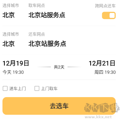 2、填寫(xiě)取車(chē)和還車(chē)相關(guān)信息,點(diǎn)擊“去選車(chē)”;