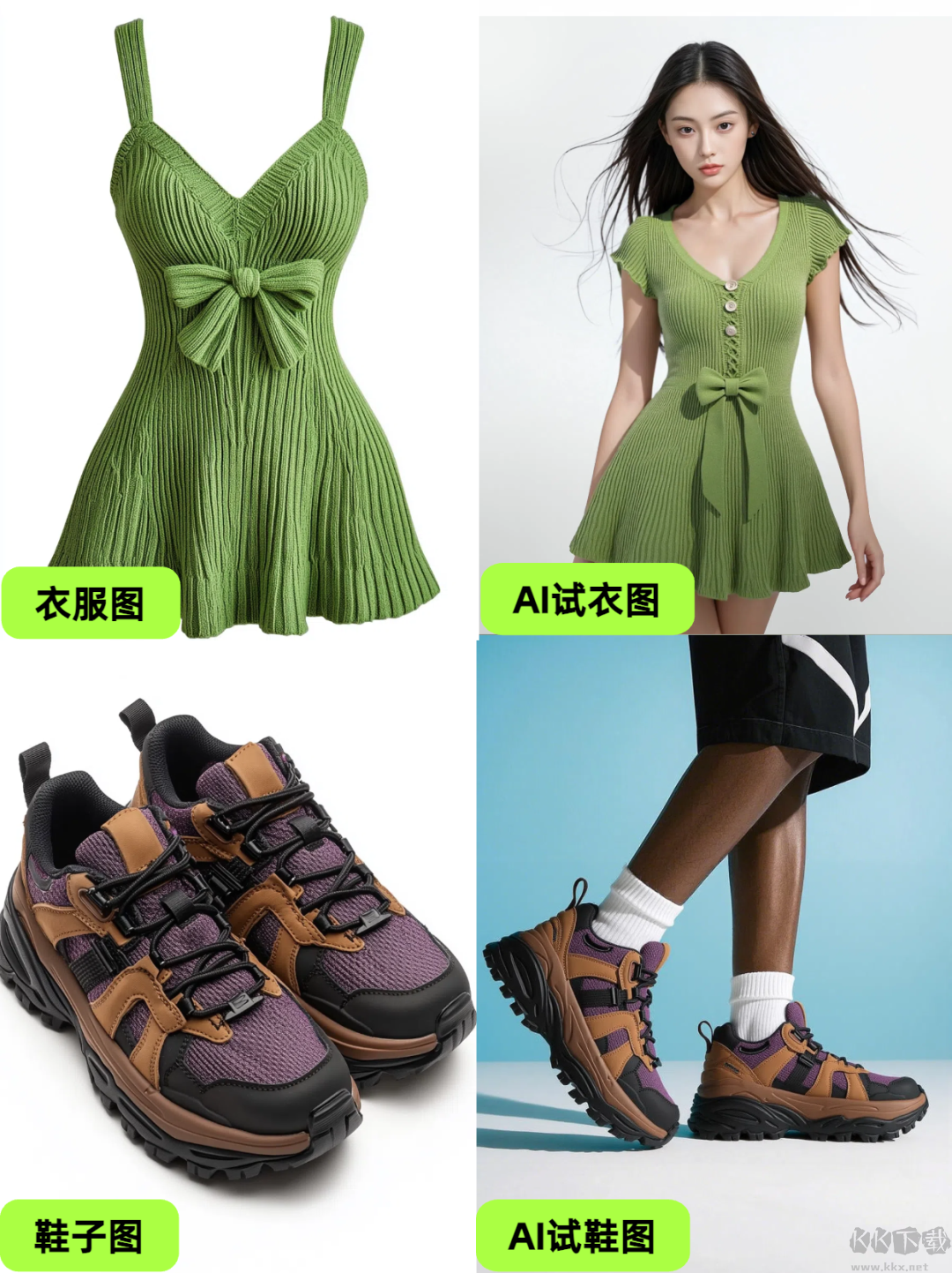 同時(shí)可生成服裝/鞋類試穿效果圖,上傳產(chǎn)品圖并選擇姿勢(shì)即可直接輸出。還提供服裝換色、去皺等便捷功能。