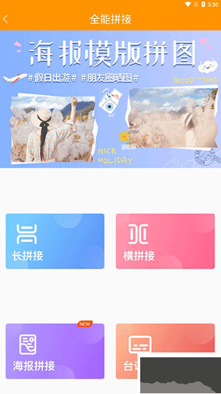 2、在【全能拼接】界面,有【長拼接】、【橫拼接】、【海報拼接】、【臺詞拼接】選項,我們選擇【海報拼接】。