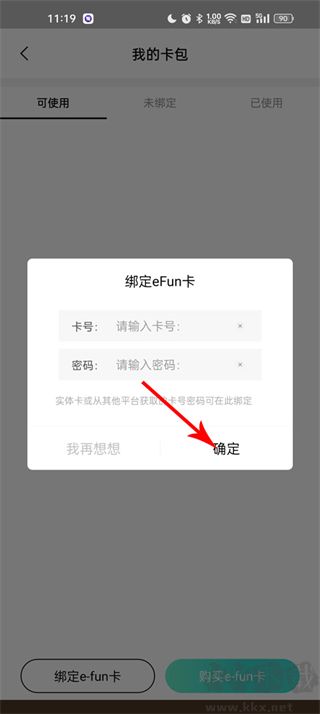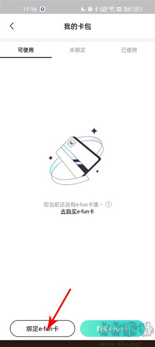 2、進(jìn)入卡包頁(yè)面后,可選擇“綁定e-fun卡”或“購(gòu)買(mǎi)e-fun卡”,點(diǎn)擊綁定