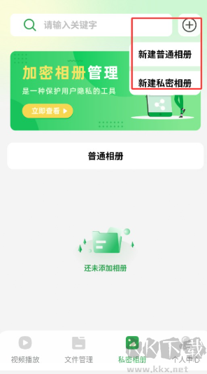 4、可通過右上角“+”創(chuàng)建加密相冊(需設(shè)置密碼),其內(nèi)容與普通相冊完全隔離存儲。