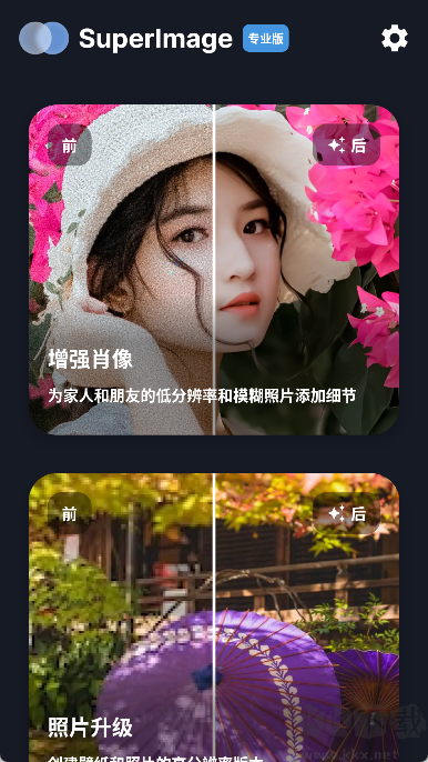 superimage pro是一款具備極強(qiáng)功能的移動(dòng)端照片編輯應(yīng)用,可以幫你把模糊照片變得清晰,或是讓舊照重拾光彩!其中最為出色的是無損放大功能,可以將圖像最大放大至16倍,并且還能維持圖像的清晰度,讓圖片不失真!應(yīng)用還能幫我們修復(fù)圖像中的模糊與噪點(diǎn),讓照片呈現(xiàn)出清晰干凈的效果,而對(duì)于那些年代久遠(yuǎn)的老照片,應(yīng)用也可以展開修復(fù)與還原操作,去除照片中的劃痕、折痕等瑕疵,讓照片再度煥發(fā)光彩,仿佛剛拍攝完成一般!